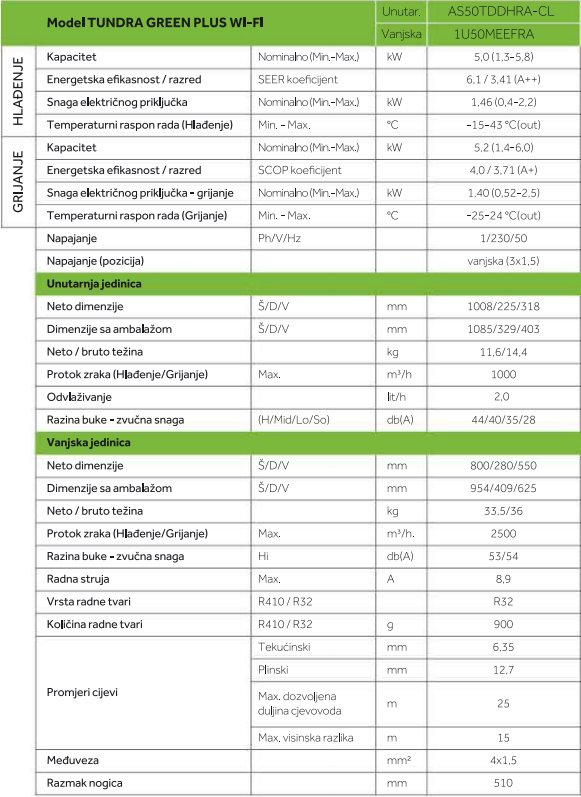 Klima uređaj Tundra Green unaprijeđen je s već instaliranim Wi-Fi modulom, funkcijom Frost Clean za dubinsko samočišćenje unutarnje jedinice i poboljšana je energetska efikasnost.